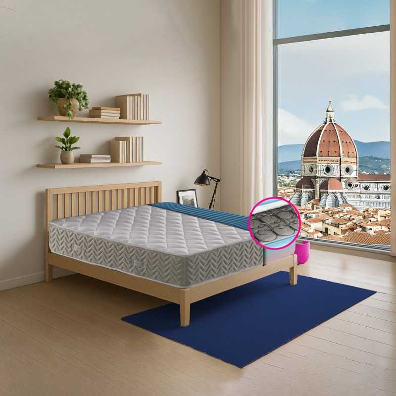 Massage orthopedic mattress with spruce soul and differentiated double lift, available in Heights 21 and 24 cm. Coated in hypoallergenic quilted fabric and anti-mite, it offers massage comfort, balanced support and optimal breathability thanks to the perimeter band with bee nest. Upside down with semi-rigid side and more rigid side, ideal for use in all seasons and to guarantee hygiene and durability.