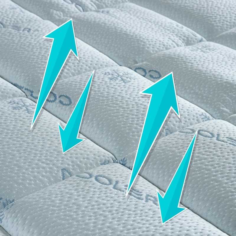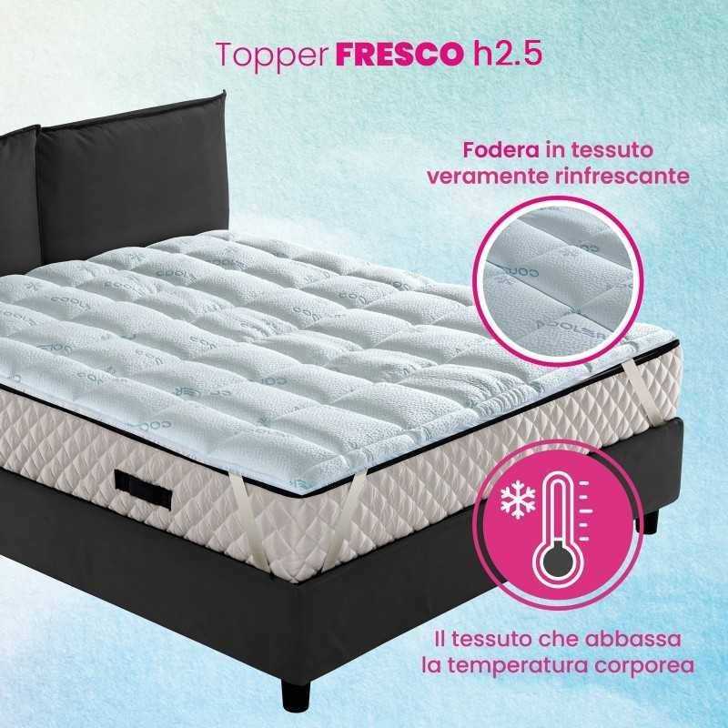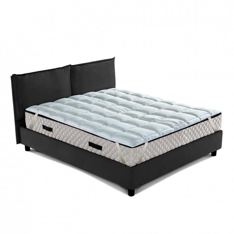 Topper with "Cooler" technical fabricTopper for mattress Cooler reduces body heat giving one feeling of freshness To the body parts in contact with it. The Cooler fabric, thanks to thermal absorption, allows Lower 1.3 ° body temperature resulting in an innovative fabric suitable for resting well during summer nights.