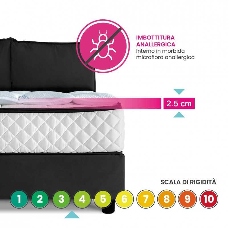 Corrector for mattresses with particular fabric that gives a pleasant feeling of freshness. This topper is also hypoallergenic and anti-mite because, inside it, there are 500 grams of polyester fiber, the only material that prevents sake from penetrating inside.
