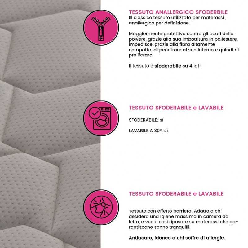 The fabric dot is the classic economic fabric used for mattresses as it is the Hypoallergenic fabric by definition. Most protective against dust mites, thanks to its polyester padding, prevents, thanks to highly compact fiber, mites to penetrate inside and therefore proliferate.