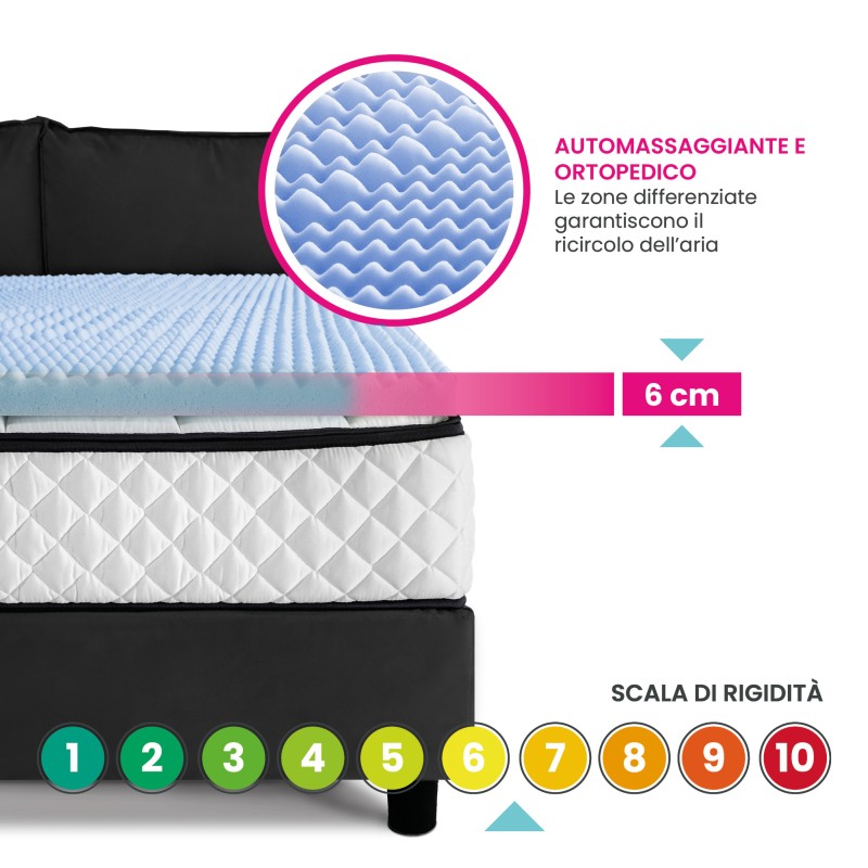 Thanks to its shaped structure and Memory Foam Made in Italy, this topper absorbs body weights evenly, guaranteeing optimal support. Originally developed for the NASAThe topper is designed to promote an internal recirculation that prevents overheating into contact with the body.