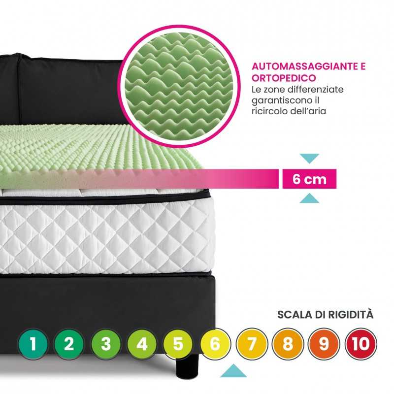 Innovative internal of topper with particular memory foam + breathable and differentiated areas. The best memory foam solution that also gives a body massage thanks to the particular surface processing. Supplied with the leg pillow.