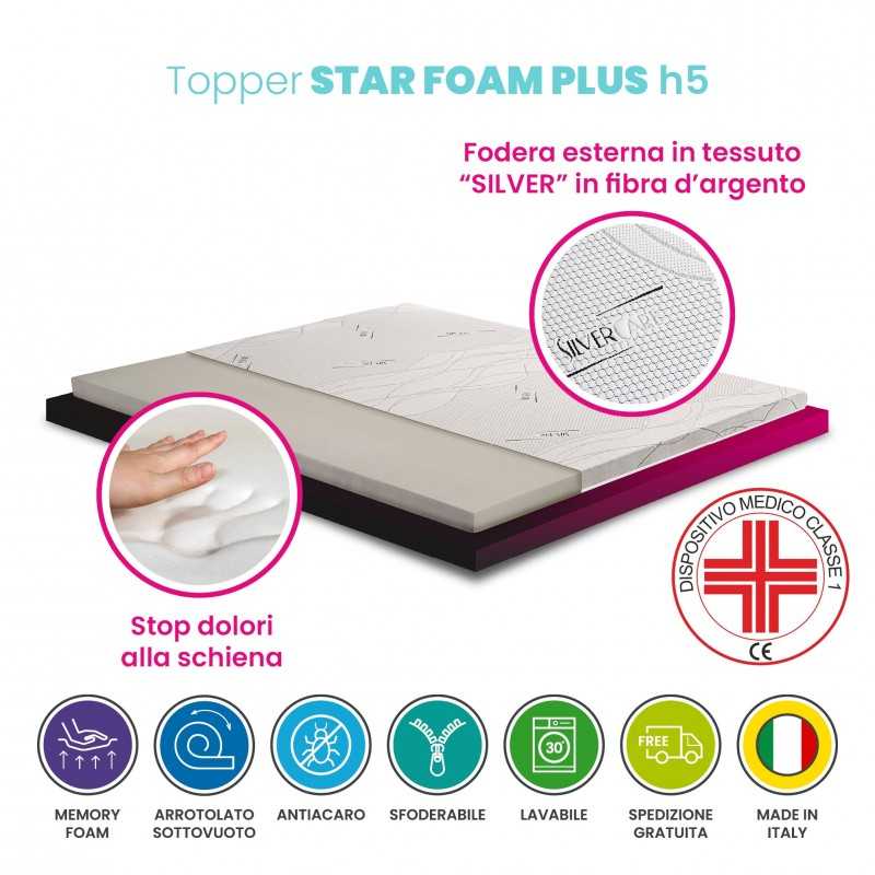 The Topper Memory Foam Star Foam Plus is covered with a special fabric enriched with Silver fibers (Silver), designed to offer a rest environment more hygienic and comfortable. Natural silver properties contribute to creating a surface hypoallergenic, antibacterial and antistatic, helping to keep the topper cooler and clean over time.