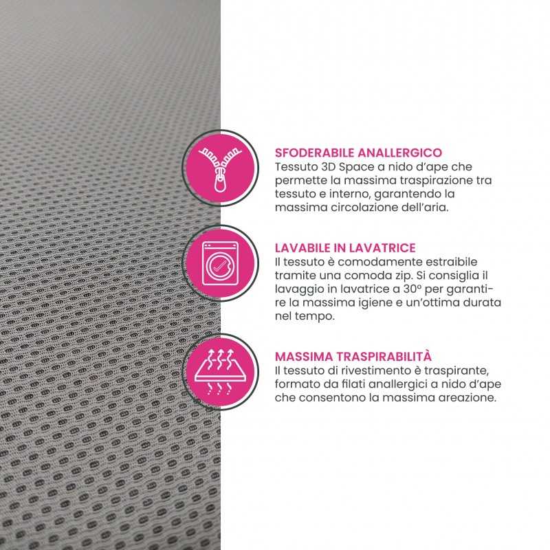 The 3D fabric with a honeycomb structure allows maximum ventilation between the product and body in contact with the fabric.